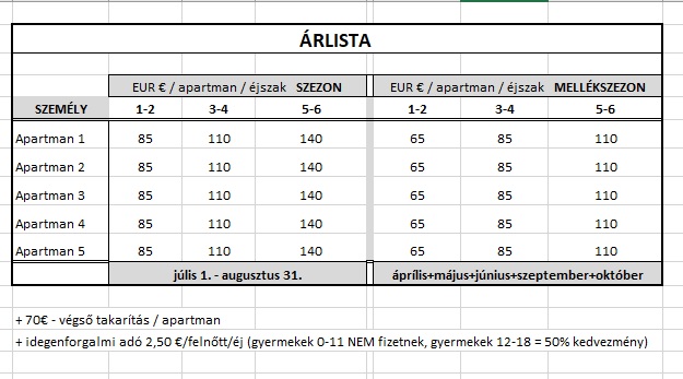 45 m2 összterületű, 2+3 apartman, melyben egy nappali konyhasarokkal és saját fürdőszobával és WC-vel (2-3 fő részére) és egy külön hálószobával (2 fő részére) található. . Az apartman teljes kapacitása tehát 5 fő. Minden apartmanhoz erkély vagy terasz tartozik. Minden apartman alapvető konyhai felszereléssel rendelkezik, beleértve a hűtőszekrényt, a tűzhelyet és az edényeket. Ágynemű + két törölköző minden ágyhoz jár.
